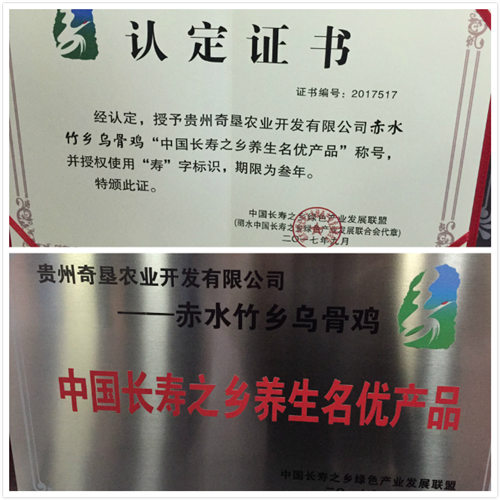2017年9月22日,中國長壽之鄉(xiāng)綠色產(chǎn)業(yè)發(fā)展聯(lián)盟在浙江杭州舉行中國長壽之鄉(xiāng)養(yǎng)生名優(yōu)產(chǎn)品博覽會(huì),奇墾農(nóng)業(yè)開發(fā)有限公司總經(jīng)理劉學(xué)強(qiáng)受邀參加。赤水竹鄉(xiāng)烏骨雞被認(rèn)定為“中國長壽之鄉(xiāng)養(yǎng)生名優(yōu)產(chǎn)品”,這是赤水竹鄉(xiāng)烏骨雞自2011年獲得“中國消費(fèi)者最喜愛的100個(gè)中國農(nóng)產(chǎn)品區(qū)域公用品牌”之后的又一殊榮。
