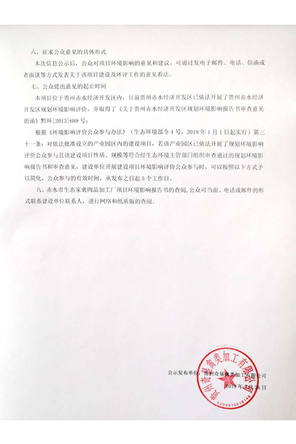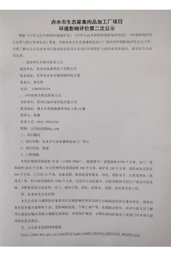 赤水市生態(tài)家禽肉品加工項(xiàng)目環(huán)境影響評價(jià)第二次公示